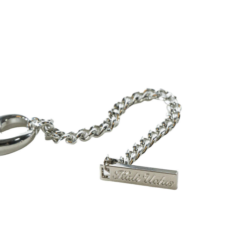 Hand assembled and made of solid polished brass with a high gloss silver electroplated finish. 16 1/2" total length and 7/8th at widest point, featuring lobster clasp and 3” extender with Kali Uchis logo charm.