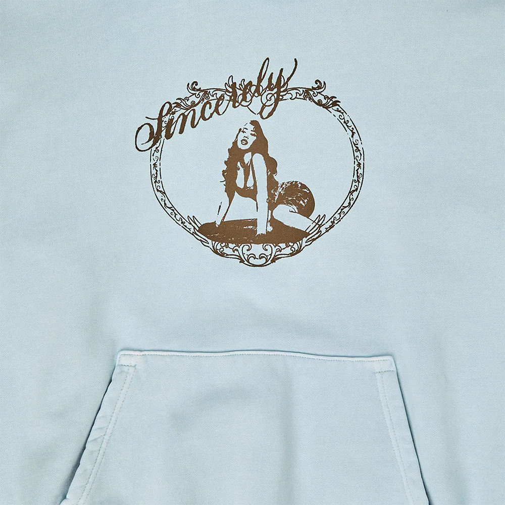 Blue garment dyed pullover hoodie featuring image/graphics on front, printed tour cities on back.