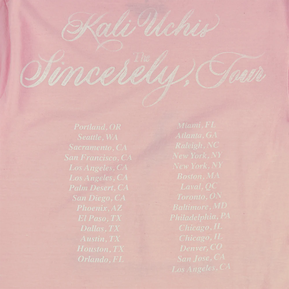Pink t-shirt featuring printed graphic on front and printed tour cities on back.